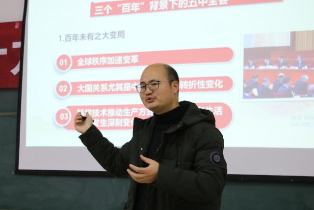 12月10日,马克思主义学院李洪运博士为新能源科学与工程学院学子作了一堂精彩的十九届五中全会精神宣讲。宣讲会由该院党委副书记主持,100余名大一新生参加了会议。
