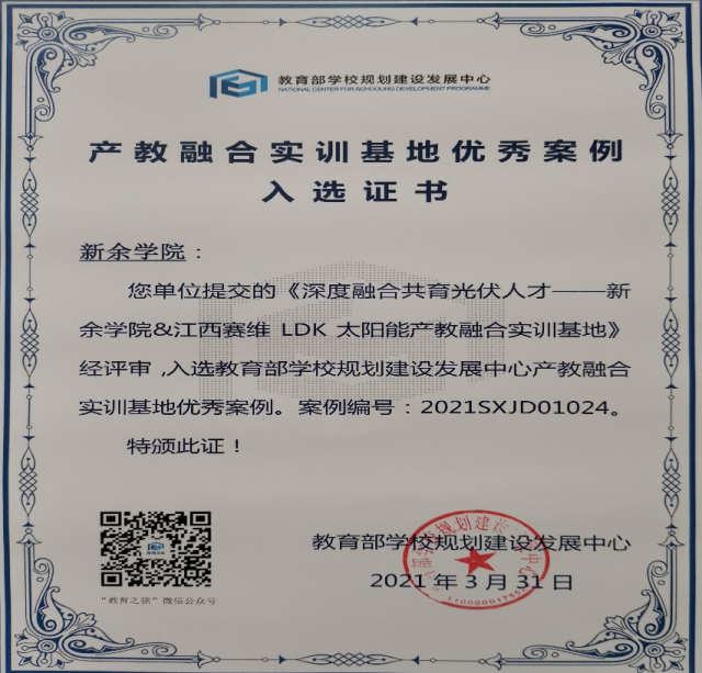 近日,由新能源科学与工程学院建设的《深度融合共建光伏人才-新余学院&江西赛维LDK太阳能产教融合实训基地》经教育部学校规划建设发展中心审核,入选教育部“产教融合实训基地”优秀案例。