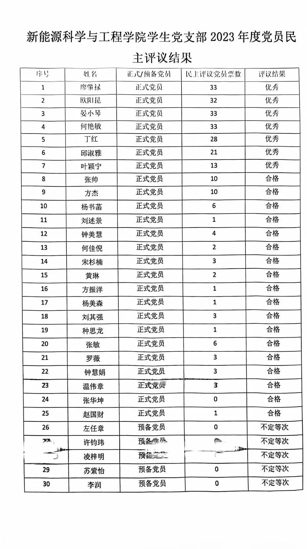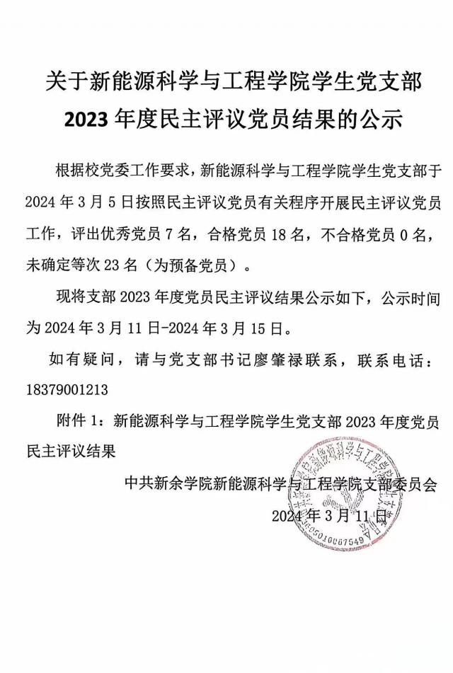 关于新能源科学与工程学院学生党支部2023年度民主评议党员结果的公示