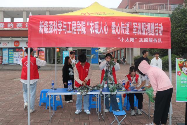 为弘扬中华民族勤俭节约的优良传统,贯彻绿色发展理念,提升青年学生的社会责任感,弘扬“奉献、友爱、互助、进步”的志愿精神,10月14日至15日,新能源科学与工程学院学生会实践部携“小太阳”志愿服务队,在11栋宿舍楼下、建行门口开展“衣暖人心,爱心传递”军训服捐赠活动。