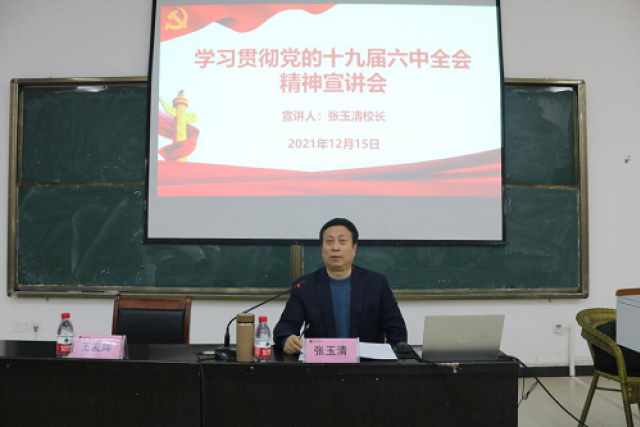 12月15日,校长张玉清在理工楼C座东面多媒体教室宣讲党的十九届六中全会精神,新能源科学与工程学院领导班子、教师代表和学生代表共计200余人聆听了宣讲报告。