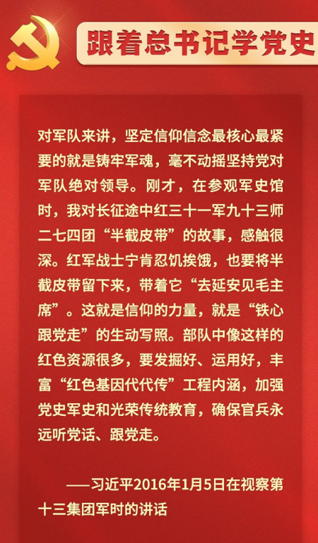 “半截皮带”浓缩的,正是革命理想高于天的坚定信仰,是战胜强大敌人和艰难险阻的精神力量。“半截皮带”的故事,已成为激励红军传人继承优良传统、“铁心跟党走”的生动教材。
