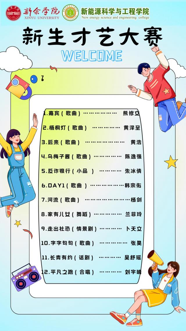 为引导新生更好地适应大学生活,新能源科学与工程学院将举办2023级新生才艺大赛决赛。本次大赛以展示技能、选拔人才、提升素质为宗旨,综合多种舞台表现方式,集红色文化、青春、友情于一体,希望2023级在人生的新起点上敢于尝试、勇于创新,不负青春梦想,凯歌奋进,扬帆远航。