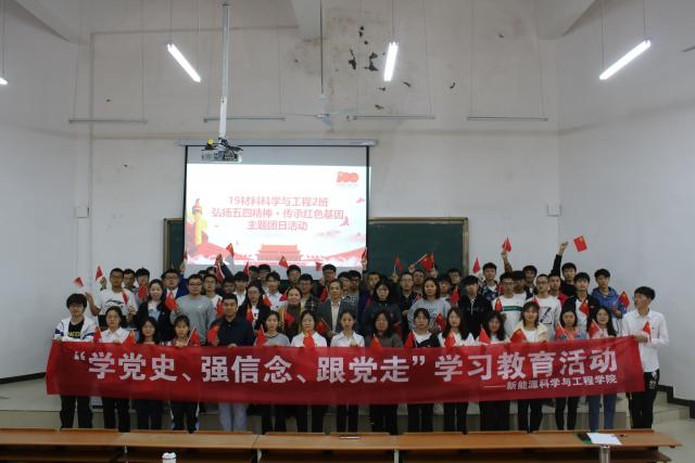 为深入贯彻落实习近平总书记在清华大学考察时的重要讲话精神,推进“学党史,强信念,跟党走”学习教育深入开展,在五四青年节来临之际,新能源科学与工程学院19材科2班于4月28日开展以“弘扬五四精神,传承红色基因”为主题的示范团日活动。 学院负责人王发辉、学院党委副书记罗新桦、学生科长欧阳昆、学院全体辅导员、19材科2班全体成员以及各班团员代表参与了此次活动。