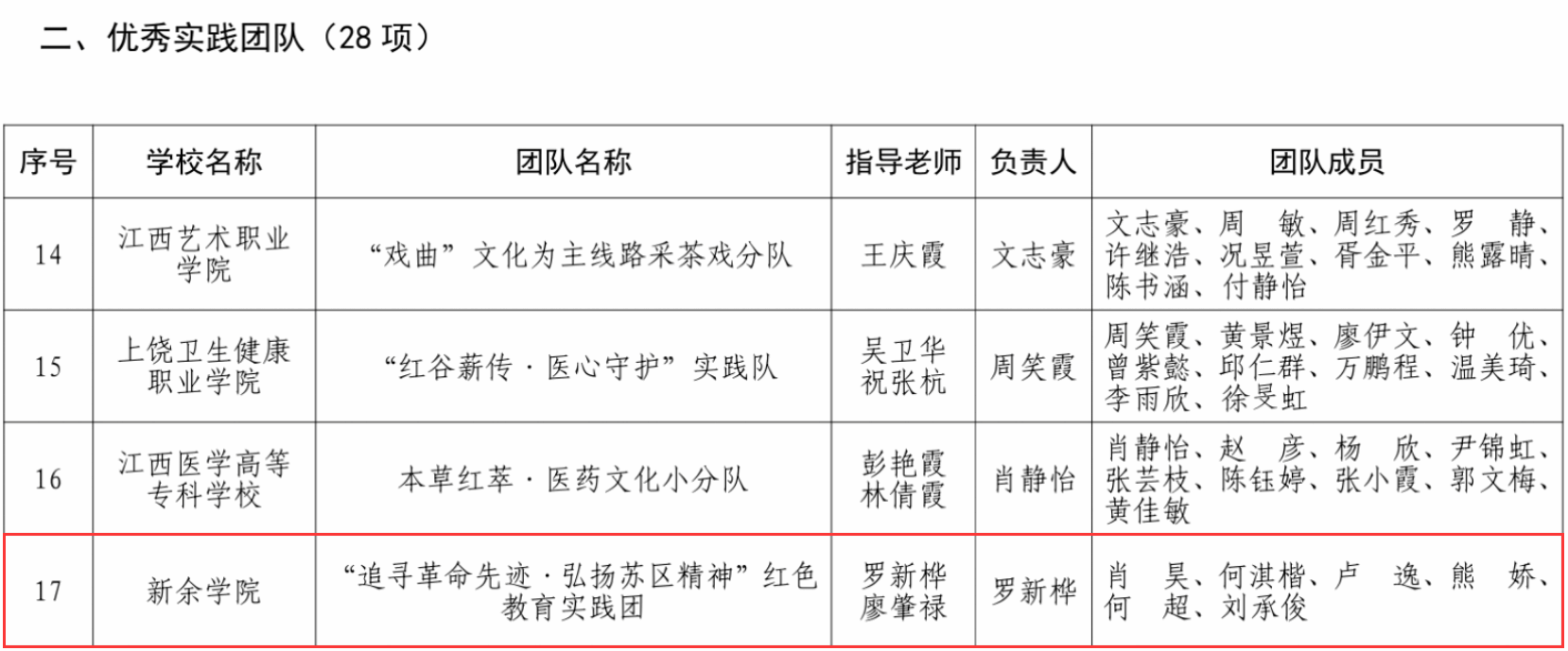 近日,省委教育工委、省教育厅等部门关于“牢记嘱托强国有我 行走赣鄱感恩奋进”江西省高校学子暑期大思政实践活动的评选结果正式公布,由我院罗新桦、廖肇禄老师指导的“追寻革命先迹·弘扬苏区精神”红色教育实践团获优秀实践团队称号。
