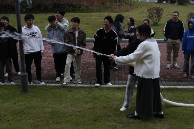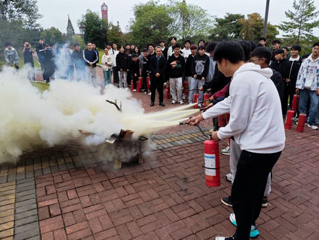 演练最后是消防器材实操阶段。王中明现场示范了如何正确使用灭火器扑灭火情,并指导学院师生使用灭火器扑灭油盆火和如何正确使用水带灭火。