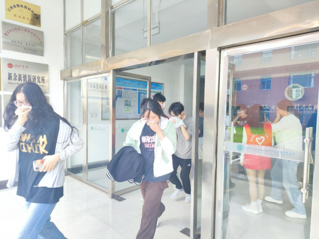 下午3点30,消防疏散应急演练正式开始,现场模拟实验楼内发生火灾。实验楼内出现浓烟,随即一阵急促的警报声响起,浓烟迅速蔓延,整栋楼烟雾滚滚。火情一经发现,保卫处立即组织人员赶赴各楼层进行应急疏散,应急救护组人员在一旁待命,随时准备急救。不到一分钟的时间,只见被困学生从所在楼层的两边沿中间楼梯移动,用衣物或沾满水的湿毛巾、手帕等捂住口鼻,低弯着腰,有序下楼,紧急疏散撤离至室外。与此同时,新余市消防救援支队新元大道特勤站消防员顺利到达现场,迅速实施营救,所有被困学生顺利脱险。
