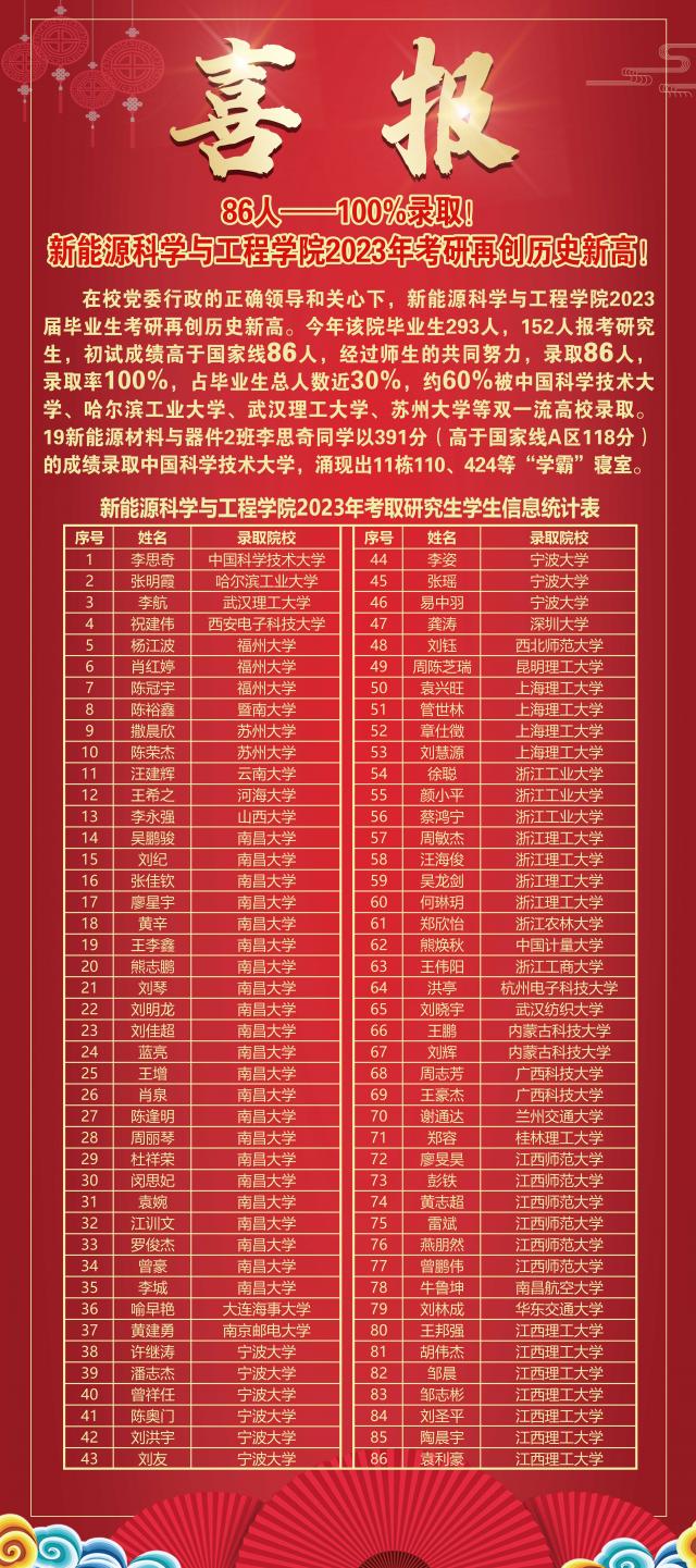 在校党委行政的正确领导和关心下,学院2023届毕业生考研再创历史新高。今年学院毕业生293人,152人报考研究生,初试成绩高于国家线86人,经过师生的共同努力,录取86人,录取率100%,占毕业生总人数近30%,约60%被中国科学技术大学、哈尔滨工业大学、武汉理工大学、苏州大学等双一流高校录取。19新能源材料与器件2班李思奇同学以391分(高于国家线A区118分)的成绩录取中国科学技术大学,涌现出11栋110、424等 “学霸”寝室。