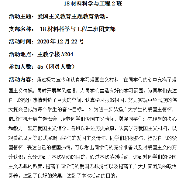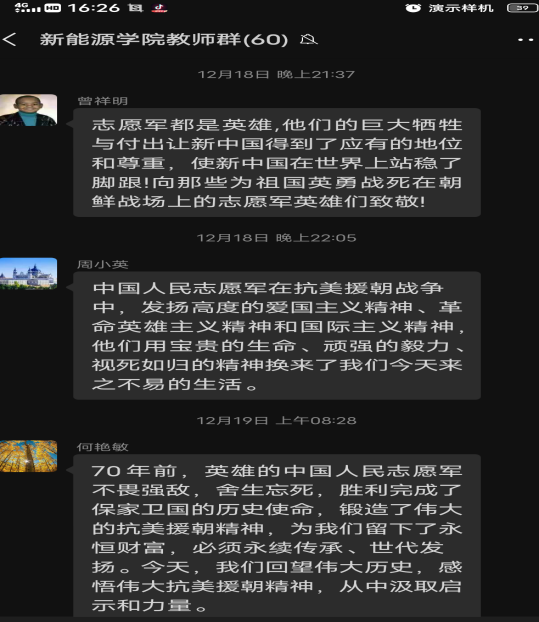 我院各班级充分利用纪念中国人民志愿军抗美援朝出国作战70周年重要契机,广泛组织18个在校班级开展爱国主义主题教育活动。通过主题班会、团日活动、党日活动等形式,介绍革命传统,讲述英雄事迹,分享个人感受。