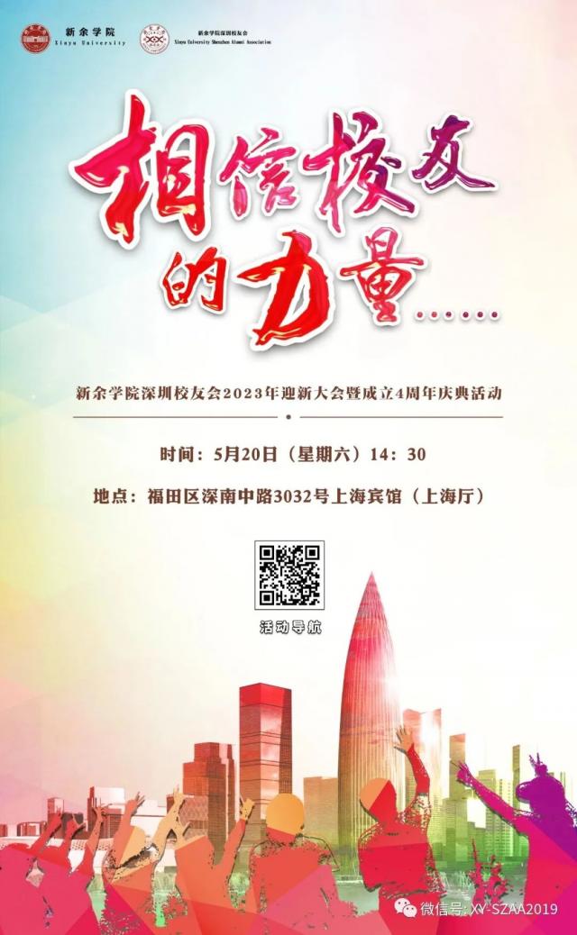 亲爱的校友,5月20日(星期六)14:30,福田区上海宾馆(上海厅),请您一定抽时间,邀上在深同学,一起参加“相信校友的力量”——新余学院深圳校友会2023迎新大会暨成立4周年庆典活动。